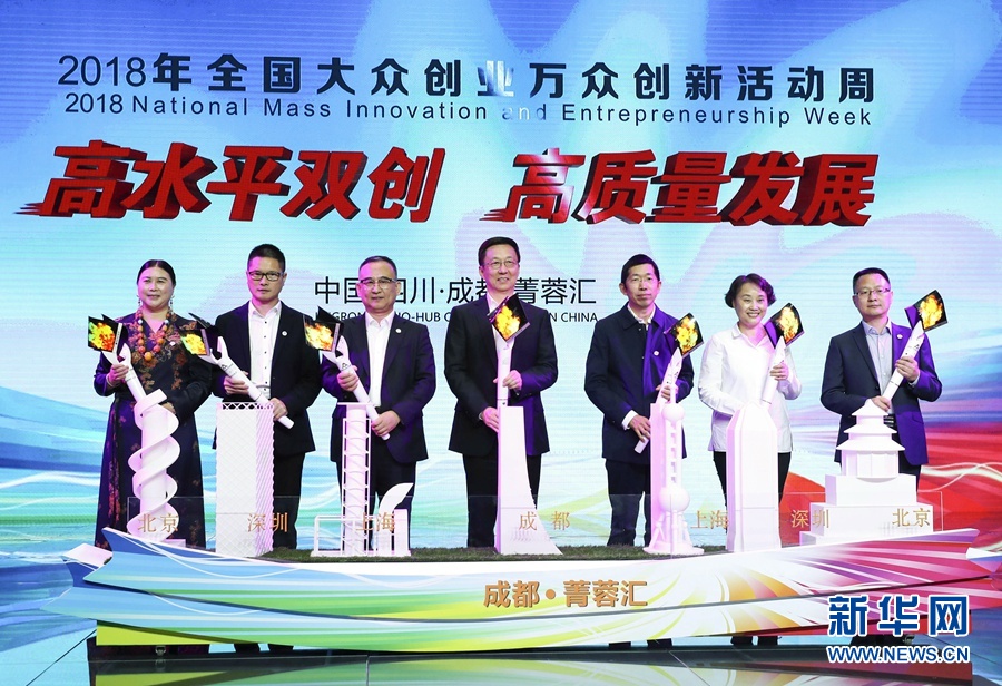 10月9日,2018年全國(guó)大眾創(chuàng)業(yè)萬(wàn)眾創(chuàng)新活動(dòng)周在四川成都拉開(kāi)帷幕。中共中央政治局常委、國(guó)務(wù)院副總理韓正出席啟動(dòng)儀式并講話。這是在啟動(dòng)儀式上,韓正與創(chuàng)新創(chuàng)業(yè)者代表共同啟動(dòng)活動(dòng)周。 新華社記者 龐興雷 攝